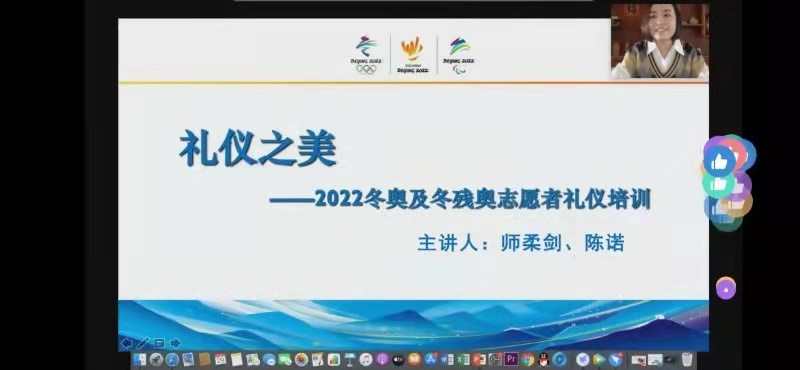 为深入贯彻落实习近平总书记关于筹办北京2022年冬奥会和冬残奥会重要指示,弘扬奥林匹克精神和志愿服务精神、进一步提升bat365官网冬奥会及冬残奥会储备志愿者综合素质,1月29日下午,“燃动青春,助力冬奥”云讲堂开播,首场主题为:礼仪之美——2022冬奥及冬残奥志愿者礼仪培训。讲座邀请艺术学院教师、冬奥会核心骨干志愿者师柔剑、陈诺两位老师主讲,300余名冬奥会储备志愿者在钉钉群以线上形式共同参加了此次培训。