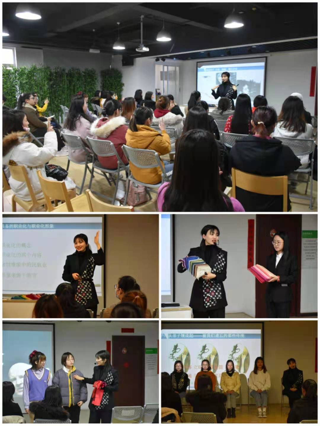 本次活动特邀悦色时尚创始人、高级礼仪培训师、国家高级化妆师评委、世界权威色彩机构Colour Me Beautiful资深讲师晨玥女士为大四女生做职场形象管理主题沙龙。晨玥认为礼仪与形象是一种生活方式,形象是最好的名片。她从职业化礼仪、职业化形象、职场仪态三个方面进行分享与示范。通过分享职场说话、着装、化妆、体态、仪态让同学们了解到职业化道德、职业化态度、职业化形象和职业化技能,避免职场形象误区,从而帮助女生提高职场软实力,提升职业竞争力。