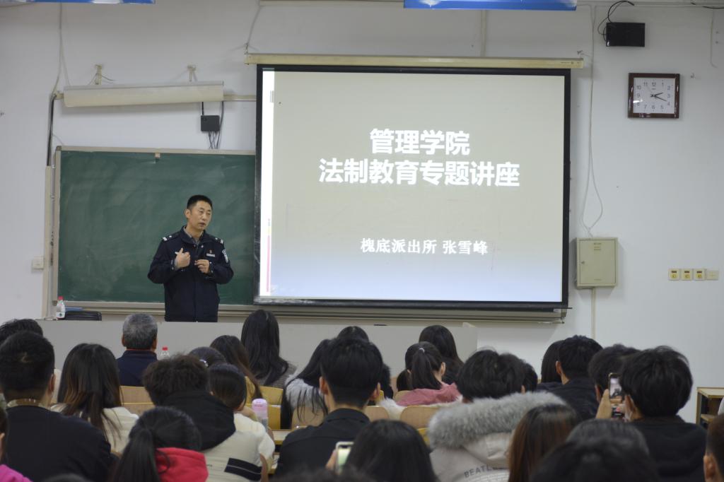 12月10日下午,管理学院邀请槐底派出所张雪峰警官来校为学院师生开展法治教育专题讲座。安全工作处处长谢锋,管理学院党委书记袁志忠、副书记初汉芳、学院全体辅导员以及各班班委参加学习。