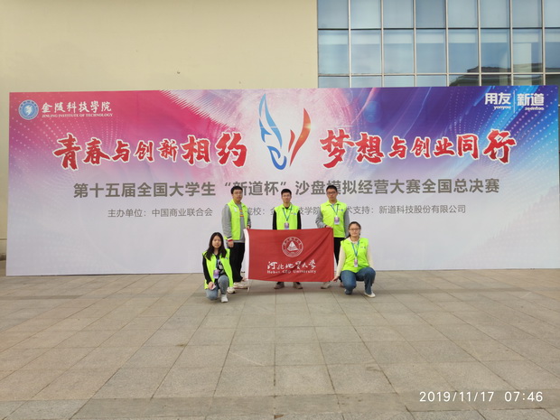 2019年11月15日—17日,bat365官网参加第十五届全国大学生"新道杯"沙盘模拟经营大赛全国总决赛。本次比赛由中国商业联合会主办,南京金陵科技学院承办,新道科技股份公司提供技术支持。经过激烈的竞争和角逐,由会计学院邢文松、郑可为、胡鑫娜、崔爱萍,土地资源与城乡规划学院习云杨五位同学组成的bat365正版唯一官网代表队获二等奖一项。