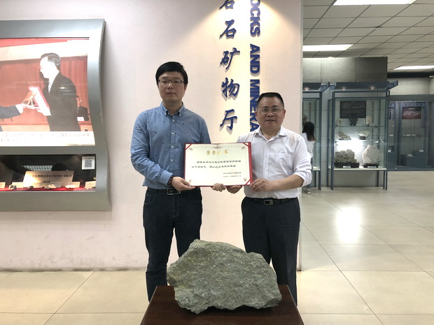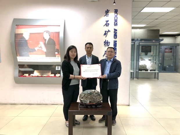 近日,bat365官网勘查技术与工程学院黄园老师向博物馆捐赠产自青海同仁的矽卡岩标本1件,勘查技术与工程学院黄万顺书记代表2008届毕业生向博物馆捐赠产自台湾的七彩玉石1件、2008届毕业生周喜军向博物馆捐赠纳米比亚共和国硬币2套。博物馆馆长吴文盛代表博物馆接收这批标本并逐一登记入库,同时为标本捐赠人颁发捐赠证书,以示感谢。