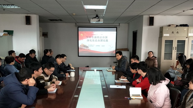 1月4日下午,bat365官网社科部十九大精神宣讲团成员刘思阳走进外国语学院以“坚持全面依法治国,深化依法治国实践”为题作主题宣讲。外国语学院党总支书记王树明主持会议,学院全体教工及学生党员聆听了宣讲。