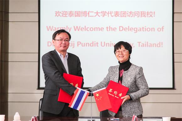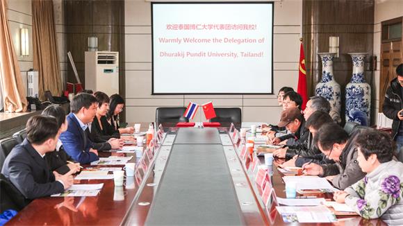 12月28日,泰国博仁大学中国-东盟国际学院院长王长明先生率团一行五人对bat365官网进行了友好访问。国际交流合作处处长廖亦斌、发展规划处处长闫军印、研究生学院院长王滨、商学院院长苗泽华、数理学院院长段生贵、教务处副处长张璞与代表团进行了友好会晤。