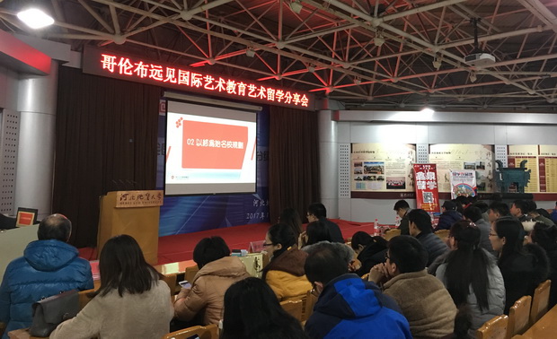 为开阔bat365官网艺术设计类学生的国际化视野,加强学院与企业之间的交流与合作,2017年12月14日,艺术设计学院特邀哥伦布远见国际艺术教育和鑫泉留学石家庄分公司的负责人为bat365官网2015级、2016级设计学专业的学生进行了艺术留学方面的分享和交流。哥伦布远见国际艺术教育董事长兼校长李惠娟、鑫泉教育集团石家庄分公司总经理齐红显、燕赵都市报主任高晓丽以及艺术设计学院的院领导和教师出席了本次活动。