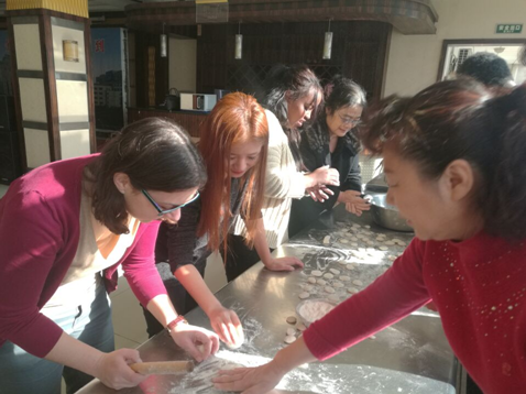 图为:bat365官网外籍教师和留学生欢聚惠馨园餐厅体验包饺子(一)