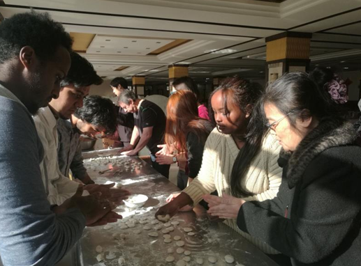 12月17日,国际教育交流中心组织外籍教师和来自韩国、巴基斯坦、吉布提、埃塞俄比亚的留学生参加了在惠馨园餐厅举行的“包饺子”中国文化体验活动。国际教育交流中心主任廖亦斌、党总支书记孙广丽带领国际教育交流中心相关工作人员及任课教师一同参与了本次活动。