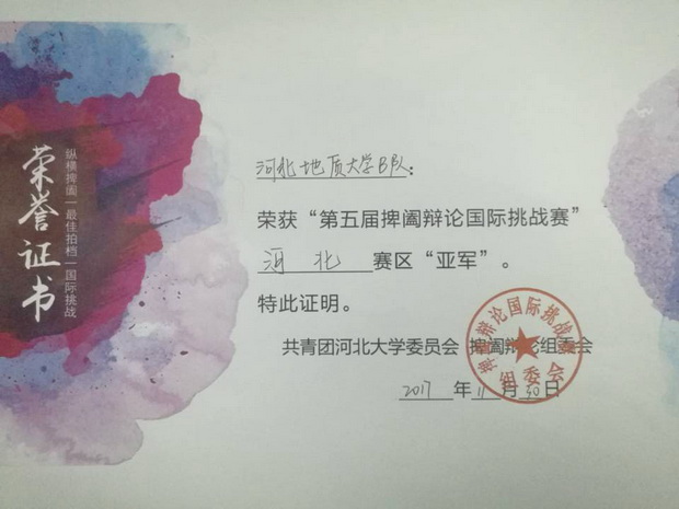 近日,由bat365官网团委演讲与辩论社团选派的辩论队员在第五届捭阖辩论国际挑战赛中取得河北赛区亚军的好成绩。