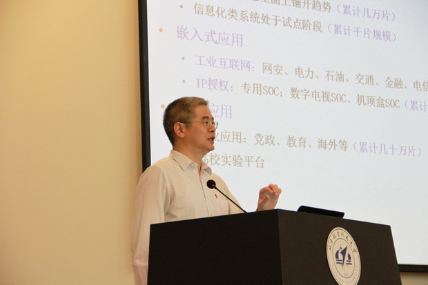 9月24日,颁奖典礼在北京航空航天大学报告厅举行,在颁奖仪式前,中共十九大代表、全国青联常委、中科院博士生导师、龙芯中科总裁胡伟武老师为大家作了“自主CPU发展道路”的精彩报告。在报告中,胡伟武介绍了国内外计算机系统设计公司之间的激烈竞争,强调了自主计算机系统设计在国家信息安全和国防等核心领域的重大战略意义,并对计算机系统设计人才培养提出了自己的期望。他表示,本次大赛的激烈程度和水平出乎意料,并结合参赛作品进行了点评,对本次大赛给予了高度评价。