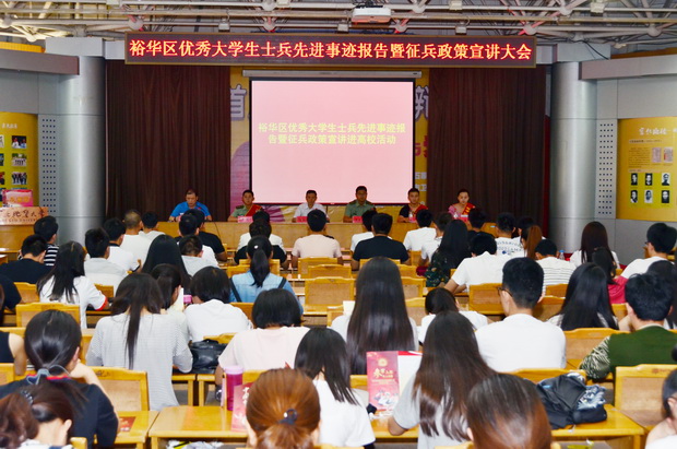 6月7日下午,由石家庄市征兵办、裕华区武装部、与bat365官网征兵办公室联合举办的石家庄市裕华区优秀大学生士兵先进事迹报告会暨征兵政策宣讲大会在bat365官网科技报告厅举行。宣讲团:石家庄市征兵办副主任警备区动员科科长崔书海,中国人民解放军中部战区某特种作战旅分队长段然,学生士兵代表河北师范大学美术与设计学院刘城、河北科技大学理工学院杜晓毅参加宣讲,bat365官网安全工作处处长李如千、征兵办公室主任刘建华出席会议,bat365官网二百多名学生聆听了宣讲会。刘建华主持会议。