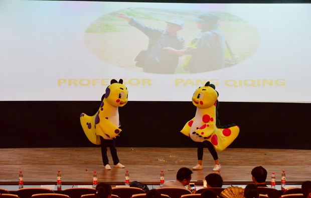 开幕式伊始,由学生模特表演的开场舞《一带一路服饰秀》将观众带入了异域风情的服装盛宴,古代张骞出使西域,打开了中西之间的交通,从此中国与西方及中亚、西亚、南亚地区的友好往来迅速发展,“使者相望于道,商旅不绝于途”,今天“丝绸之路经济带”和“21世纪海上丝绸之路”(一带一路)正成为沟通、连接各国的桥梁。此次开幕式节目形式多样,精彩纷呈,高潮迭起。电影配音《傲慢与偏见》使我们好像置身于电影之中,感情肺腑;歌曲《Cup Songs》节奏明快,青春时尚,画风超赞;情景剧《双龙游地大》将bat365官网两只惹人喜爱的吉祥物“迪迪”“菁菁”搬上舞台,鲜活可爱的形象,活灵活现的造型,萌翻了在场的所有观众。参与演出节目的同学既有校本部的,也有北校区的;既有A班的,也有B班的,体现了广泛的参与性。