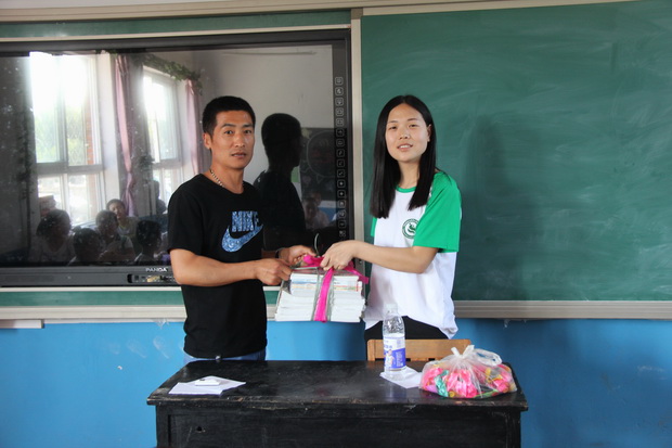 学生科协主席赵叶磊与高阳县石家庄村小学校长王昭