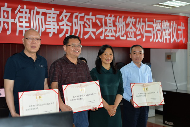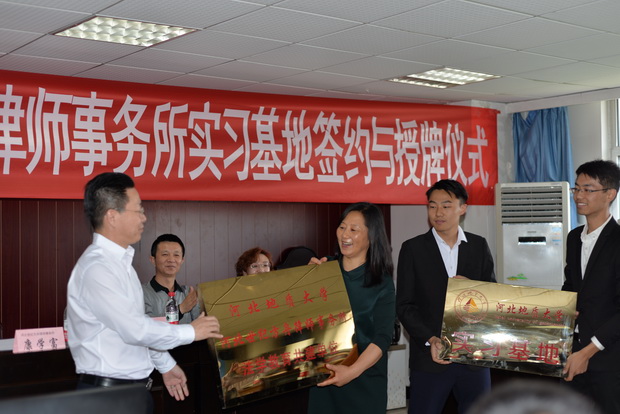 侯丽艳与康学富共同签订了建立实习基地(优秀生源输送基地)协议,并为实习基地揭牌。随后,侯丽艳还向河北世纪方舟律师事务所许克军、陈振谦、张小波律师颁发了聘书,聘任三位资深律师为法政学院客座教授。