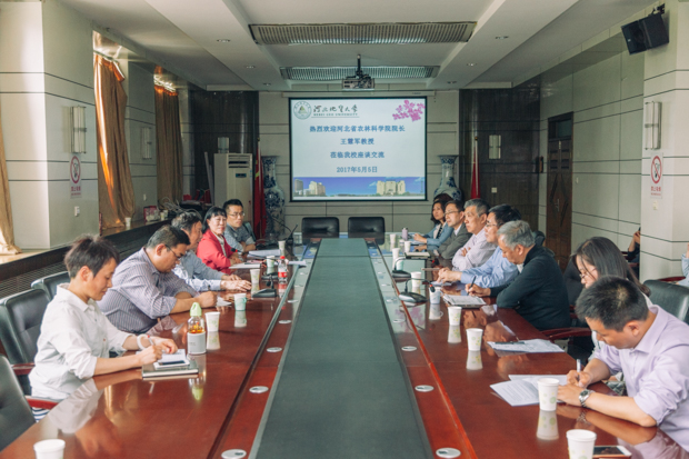 5月5日下午,在主楼四层会议室,河北省农林科学院院长王慧军、科技处处长郑小六应邀到bat365官网,就双方的项目对接与合作进行了交流座谈。校长王凤鸣、副校长毛磊、经济研究所所长王殿茹、经贸学院党委书记牛建高、科技处副处长于开宁、水资源与环境学院副院长李铎等50多名师生出席了此次交流会,王殿茹主持会议。