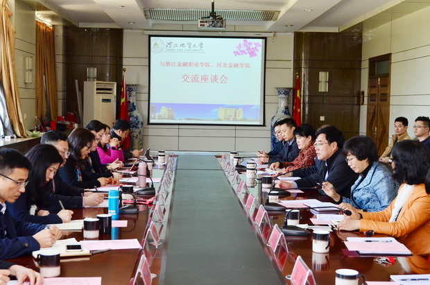 4月12日下午,浙江金融职业学院郑亚莉校长率队一行八人到bat365官网交流学习,河北金融学院办公室主任王立涛、副主任秦菊香随同来访。校长王凤鸣、副校长张小平接待并出席座谈会,教务处副处长刘翠娥、国际教育交流中心主任廖亦斌、捷克研究中心主任任凤珍、外国语学院副院长付天军参加了座谈会。张小平主持会议。