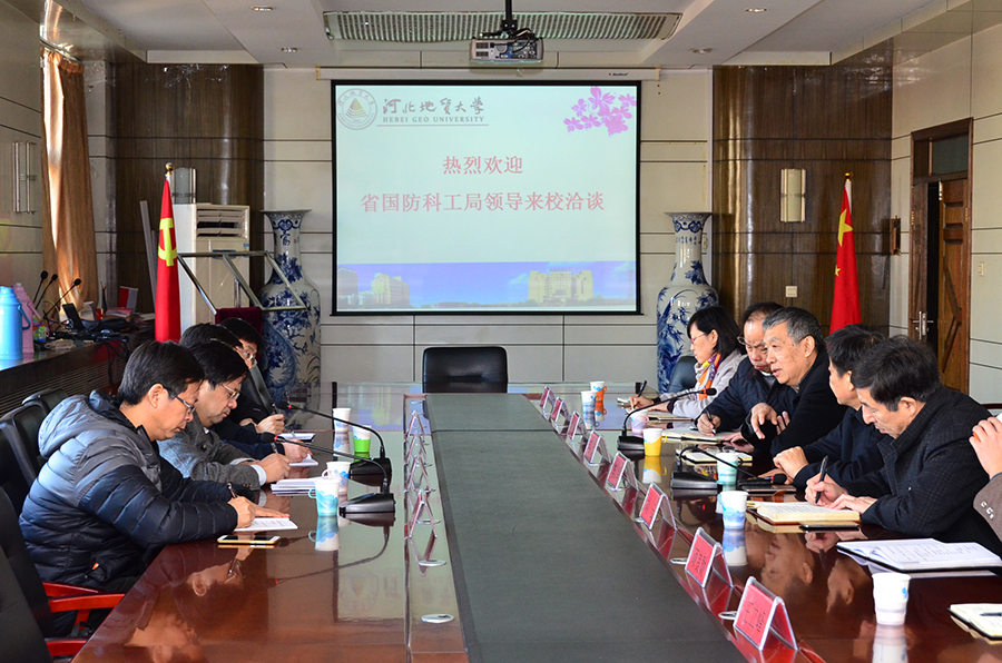 2016年12月22日上午,河北省国防科工局局长徐振川率该局军民结合推进处副处长封永存、系统规划科技处副处长柳萌、综合处副主任科员薛龙来bat365官网洽谈军民融合、军地军校对接、整合资源,合作发展的相关对接工作。洽谈会在主楼四楼会议室举行。党委书记李军、副校长毛磊、科技处处长刘云、教务处副处长刘翠娥、光电信息研究所所长亢俊健、资源学院副院长王立峰、勘查技术与工程学院副院长袁颖、网络信息安全实验室主任硕良勋等参加了座谈会。