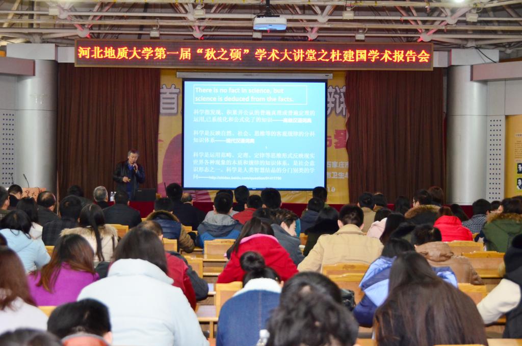 杜建国研究员以“什么是科学”作为切入点,强调了全面观察、从四维空间科学地分析问题对于地学研究的重要性。随后对国内外地震前沿研究进行了介绍,对断层产生地震学说提出质疑,并对隐爆角砾岩的分布特点、隐爆产生地震等研究成果进行了介绍。杜建国研究员精妙的语言和详细而深刻的讲解引起阵阵掌声,现场师生均表示收获颇丰。