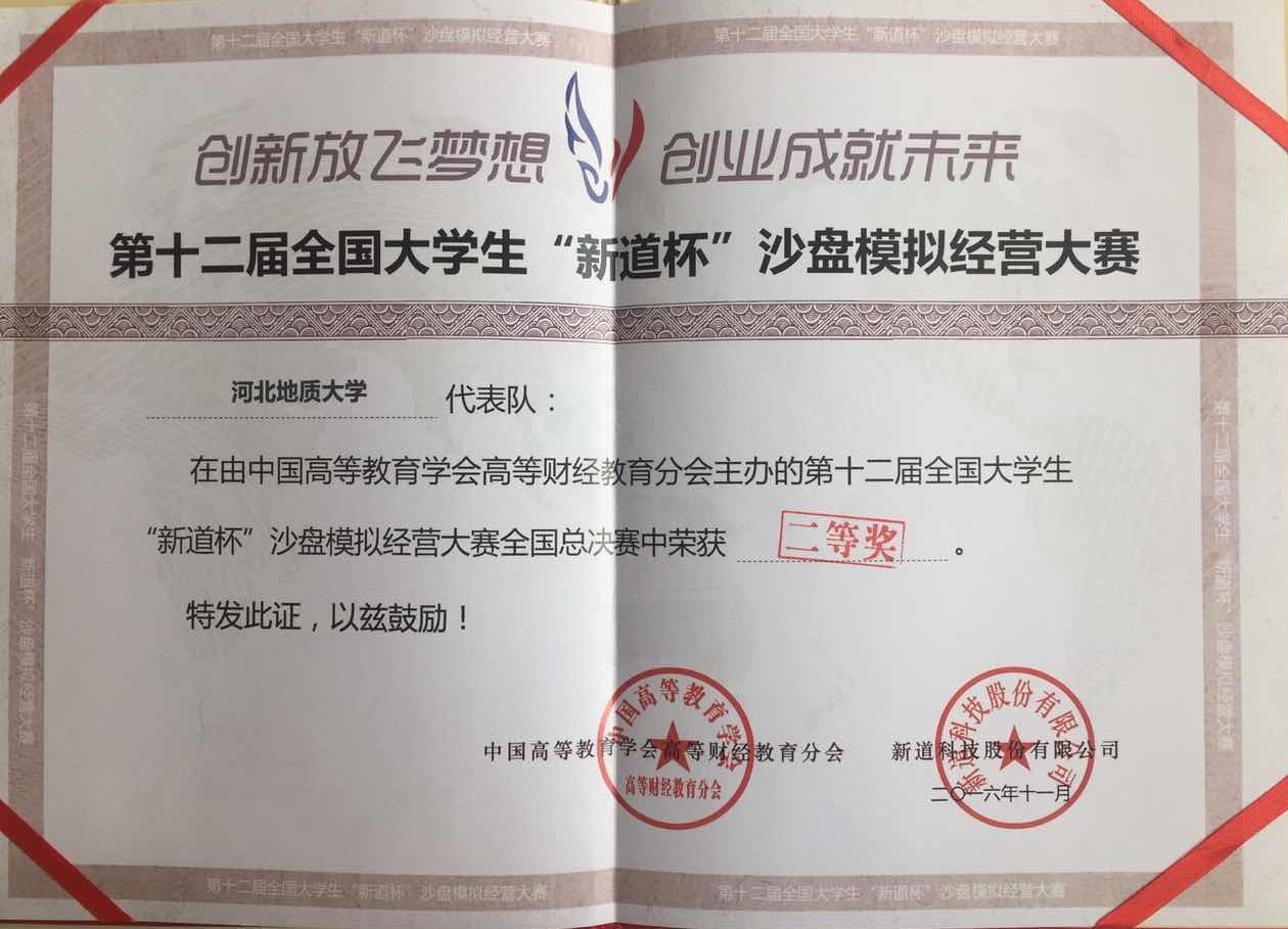 “新道杯”全国大学生沙盘模拟经营大赛是由中国高等教育学会高等财经教育分会主办、桂林电子科技大学承办、新道科技股份有限公司提供技术支持的全国性赛事。旨在锻炼学生团队协作意识、沟通技巧、创新精神,为大学生提供模拟企业经营的环境,使其能深入了解企业经营的模式,在模拟环境中实现自己经营企业的梦想。