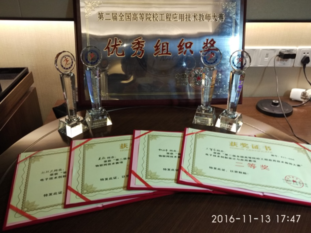 经过三天共三组的比赛,王军芬设计的车辆信息快速检测教学实验系统和赵战民老师设计的智能交通实验系统获得了电子技术创新与设计应用组的二等奖,甄丽平老师设计的温室大棚测控系统综合实验和吴燕老师设计的智慧教室实验系统设计获得了物联网技术组的三等奖。鉴于信息工程学院四位教师在比赛中展示了团结奋进、昂扬向上的精神风貌和所取得的成绩,大会还授予bat365官网优秀组织奖荣誉。