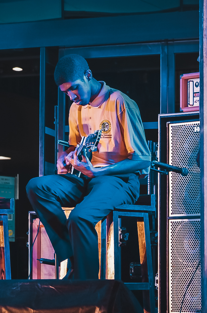 音乐会正式开始后,特纳博士为同学们讲解了爵士乐的起源和发展,并一一介绍了乐队的成员们。他幽默的讲解赢得了同学们的阵阵掌声和喝彩。随后,乐队分别为观众们演奏了《所有蓝调》、《恢复正常》、《变色龙》、《威士忌,不加水》、《孟克蓝调》、《烟雾朦胧》、《永远在此》、《印象》。乐队在遵循原有曲调的情况下稍加改变曲风的演奏让人心旷神怡,十分愉悦,同学们情不自禁地用手打着拍子应和着。
