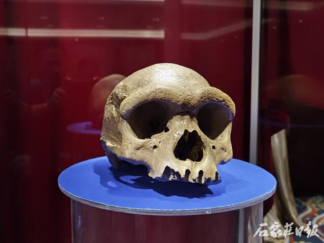 在发布会现场的玻璃展示柜内,只见古人类头骨化石保存完整,长而低的脑颅,额骨不隆起,顶骨轮廓平缓,眉脊弯曲且异常粗壮。