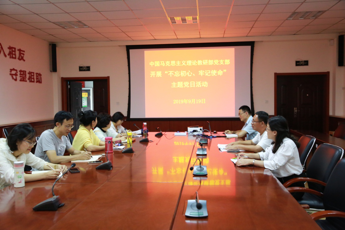 为庆祝新中国成立70周年,根据学院党委《关于开展“不忘初心、牢记使命”主题教育实施方案》,9月19日,中国马克思主义理论教研部党支部开展“我的初心使命”主题党日活动,活动由党支部书记高千主持,全体党员参加。