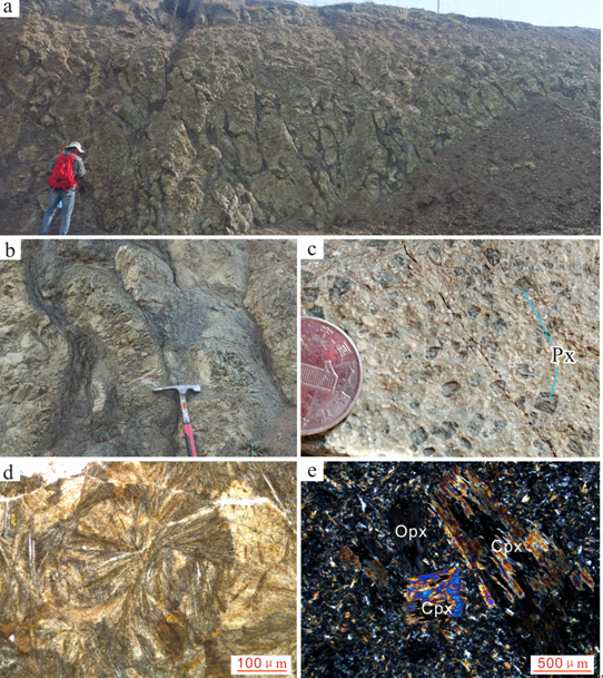 (a)枕状FAB宏观野外露头;(b)单个枕状FAB野外露头;(c)富含辉石斑晶的玻安岩野外露头;(d)枕状FAB的球颗结构显微镜下照片;(e)含单斜辉石和斜方辉石斑晶的玻安岩显微镜下照片