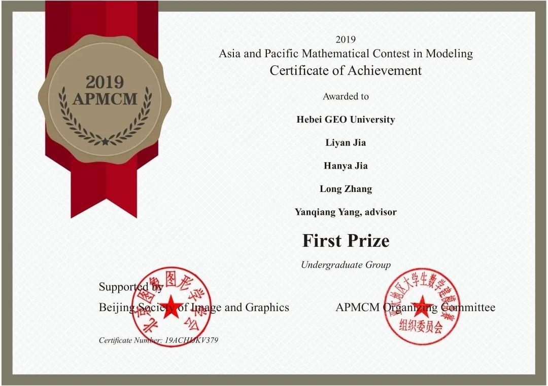 2019年亚太地区大学生数学建模竞赛(APMCM)一等奖;